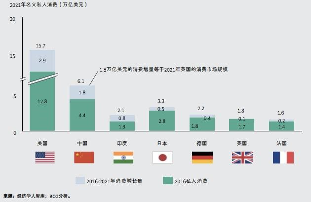 根据经济学人智库(EIU)的数据和波士顿咨询公司(BCG)的分析,2016-2021年中国的消费增长量达1.8万亿美元,预计到2021年,中国消费市场仍将扩大近一半,达到6.1万亿美元的规模。